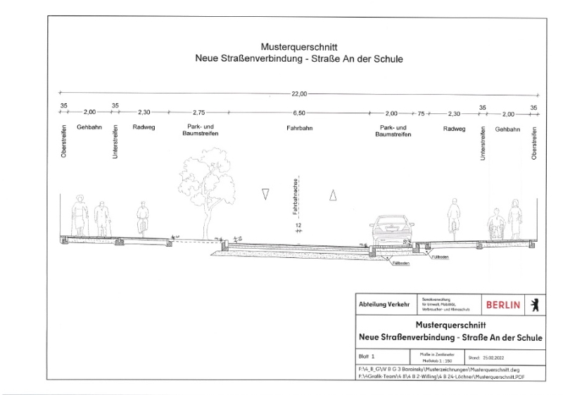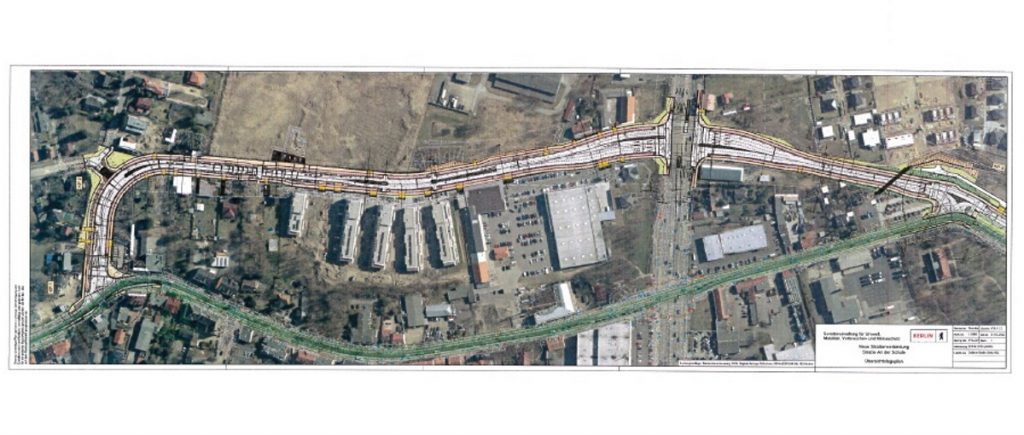 In Höhe des Gründerzeit Museums in Mahlsdorf soll eine neue Straßenverbindung durch eine Verlegung der Straße Richtung Gewerbegelände erfolgen. Diese soll über die Kreuzung „B1 / An der Schule“, entlang des Edeka, der ISS Schule in Mahlsdorf und abschließend an der „Pestalozzistraße“ vorbei am Stadtteilzentrum verlaufen. Die Straße „An der Schule“ wird zweispurig ausgebaut, und erhält einen Geh- und Radweg. Auf der Rückseite finden Sie dazu Planskizzen.