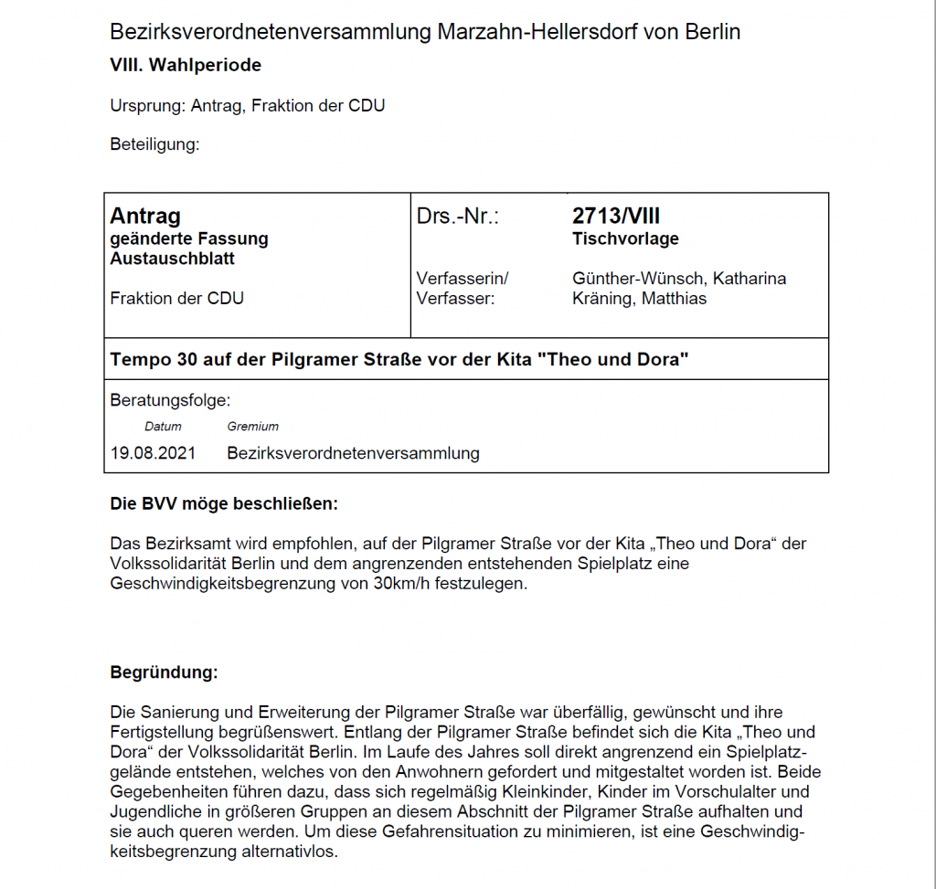Schon im Sommer habe ich Bezirksverordnete einen Antrag auf „Tempo 30“ gestellt und dieser wurde mit Unterstützung der zuständigen Stadträtin und der Mehrheit der BVV angenommen.