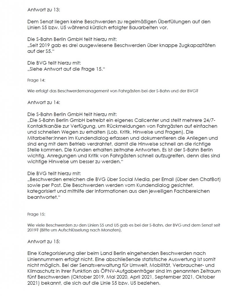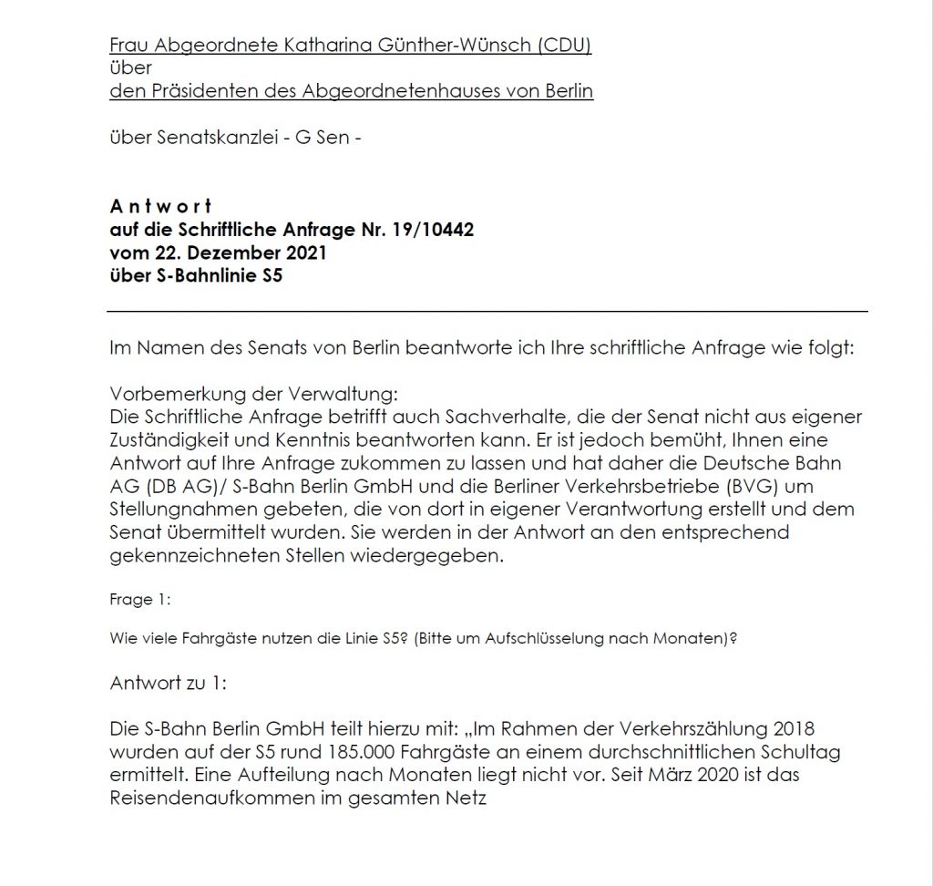 Deshalb habe ich mich an den Senat gewandt und eine umfangreiche Anfrage zur Linie S5 eingereicht.