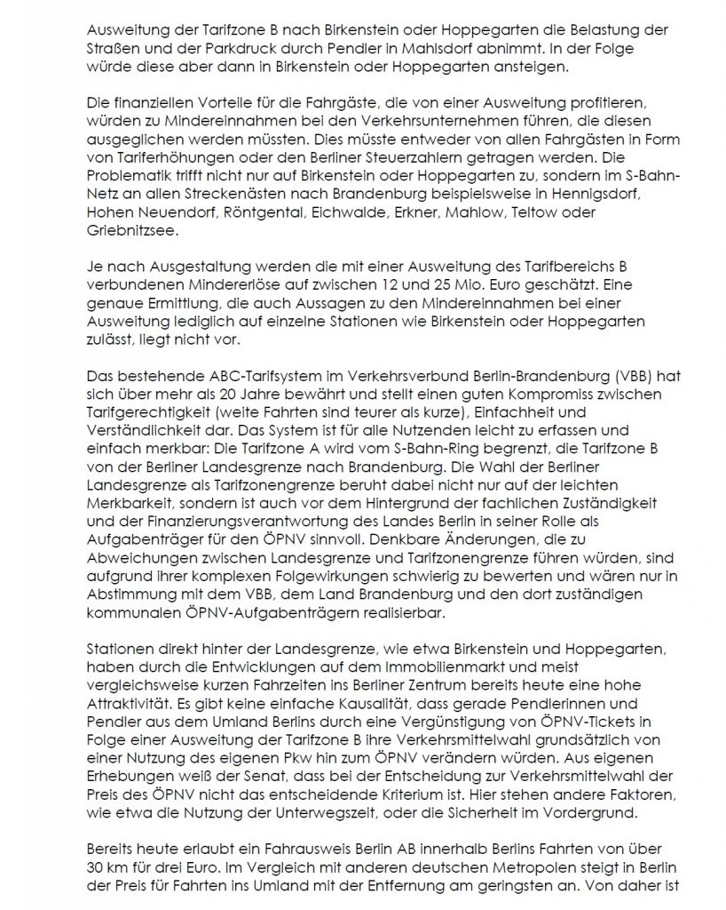 Ausweitung des Tarifgebietes auf die Bahnhöfe Birkenstein und Hoppegarten: Hier muss ich Ihnen leider mitteilen, dass der Senat dieses Ziel aktuell nicht weiterverfolgen wird. Die Begründung hierfür erschließt sich mir nicht. Es wird mitgeteilt, dass man das Problem der Straßen- und Parkbelastung nur in die Gemeinde Hoppegarten tragen würde. Ich bin weiterhin daran interessiert die Tarifgebiete in das angrenzende Brandenburger Umland auszuweiten. Deshalb werde ich mich dafür einsetzen, gemeinsam mit dem Bürgermeister der Rennbahngemeinde Hoppegarten konstruktive Lösungen zu erarbeiten.