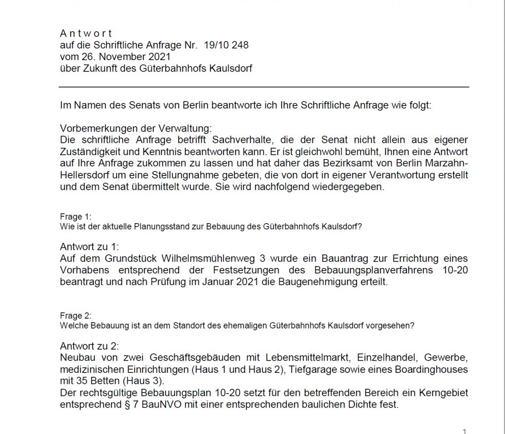 es haben uns in den letzten Wochen vermehrt Anfragen zum Bauvorhaben am Güterbahnhof Kaulsdorf erreicht. Das habe ich zum Anlass genommen und gemeinsam mit meinem Kollegen und Abgeordneten für Kaulsdorf-Nord, Alexander J. Herrmann, eine Anfrage an den Senat gestellt.