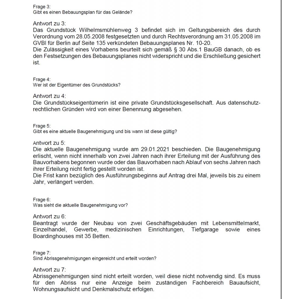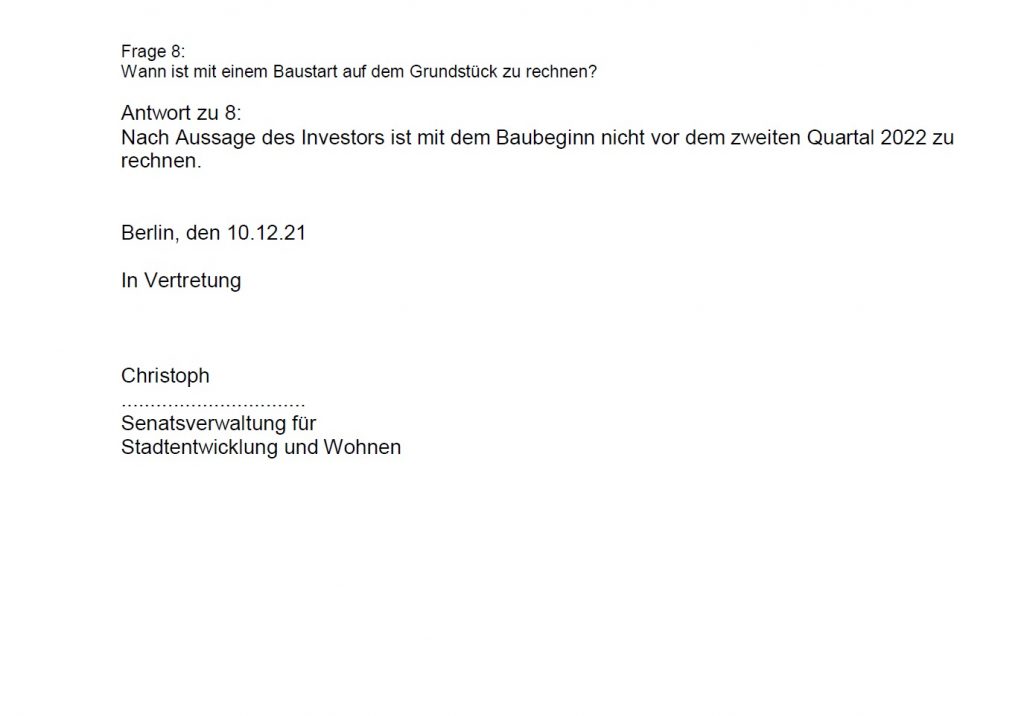 Ich habe mich deshalb mit einer schriftlichen Anfrage an den Berliner Senat gewandt und den aktuellen Planungsstand angefragt.