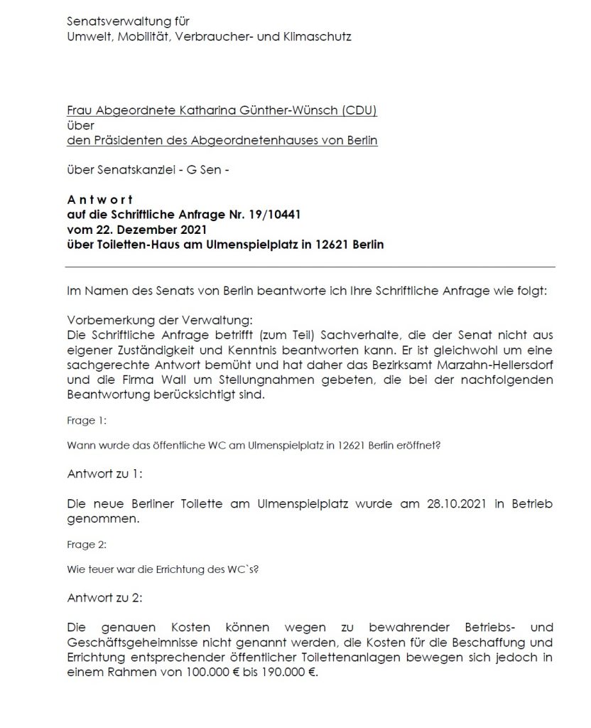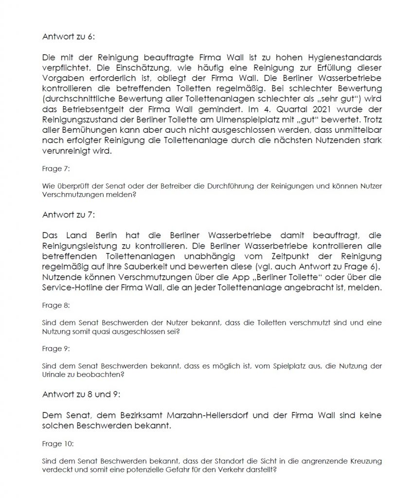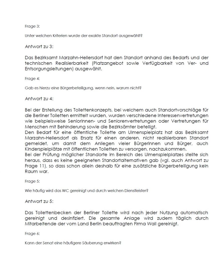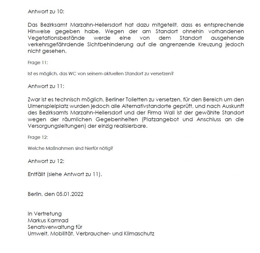 Grundsätzlich begrüße ich die Errichtung von WC-Häusern und am Beispiel des kürzlich errichteten Hauses am S-Bahnhof Mahlsdorf, kann man auch die positiven Effekte beobachten. Wir werden aber beobachten müssen, ob es wirklich zu keiner Verkehrsgefährdung durch den Standort kommt und die Sauberkeit auch in Zukunft gewährleistet ist.