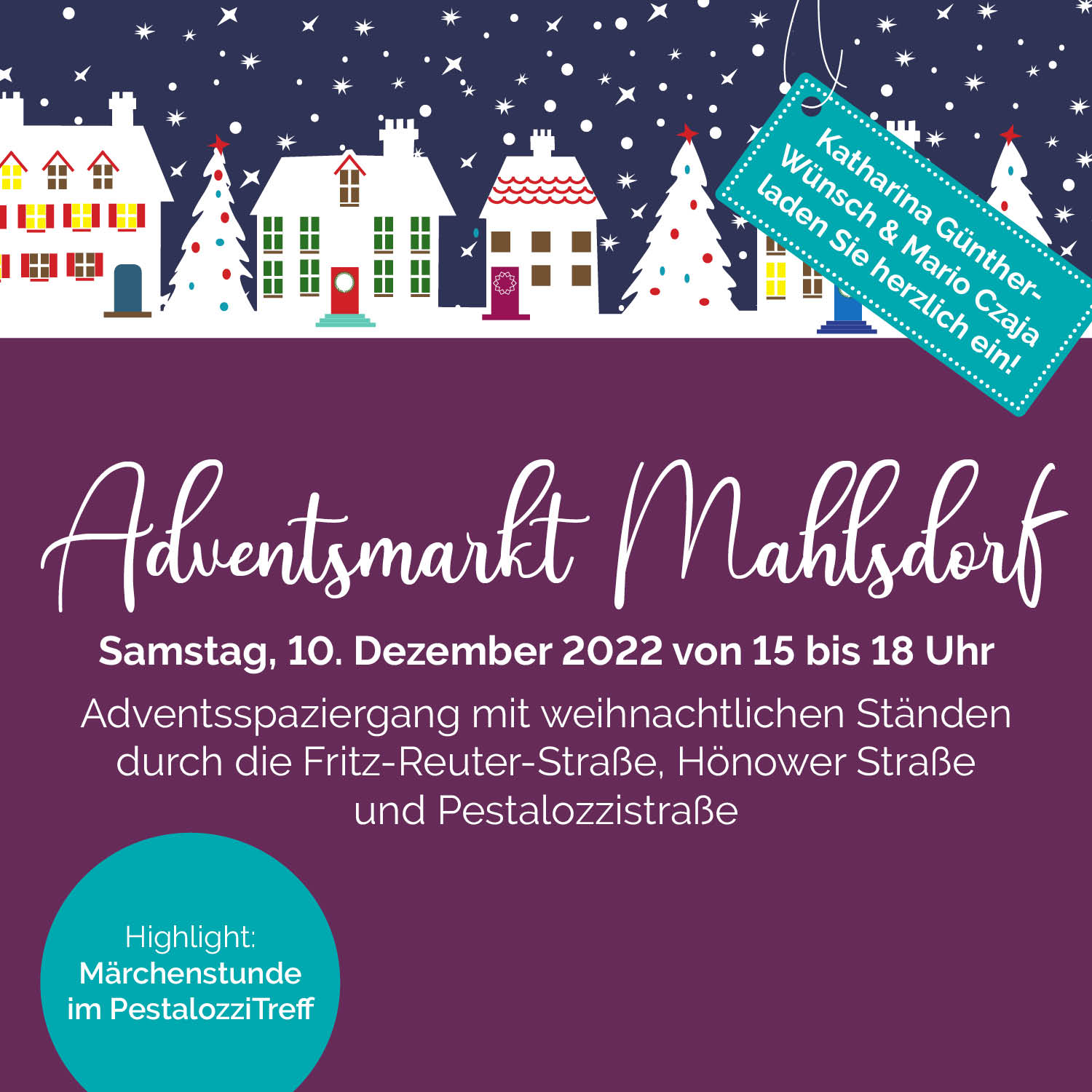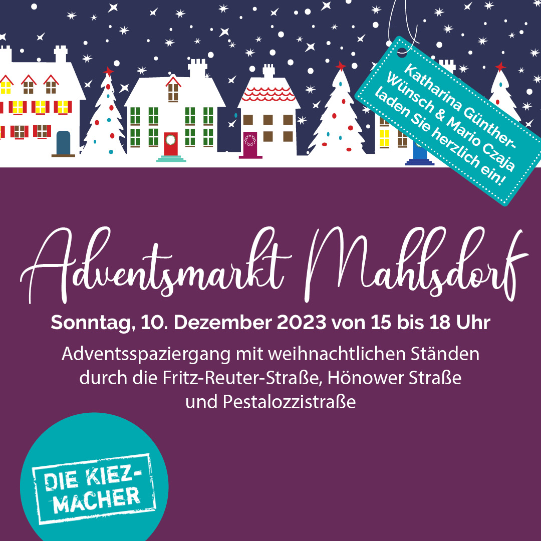 Fritz-Reuter-Straße Fritz-Reuter-Straße, 12623 BerlinLiebe Anwohner, auch in diesem Jahr findet unser traditioneller Adventsmarkt statt. Am Sonntag den 10.12.2023 von 15-18 Uhr können Sie wieder rund um die Fritz-Reuter-Straße und der Hönower Straße viele Angebot entdecken und die besinnliche Adventszeit einleiten.